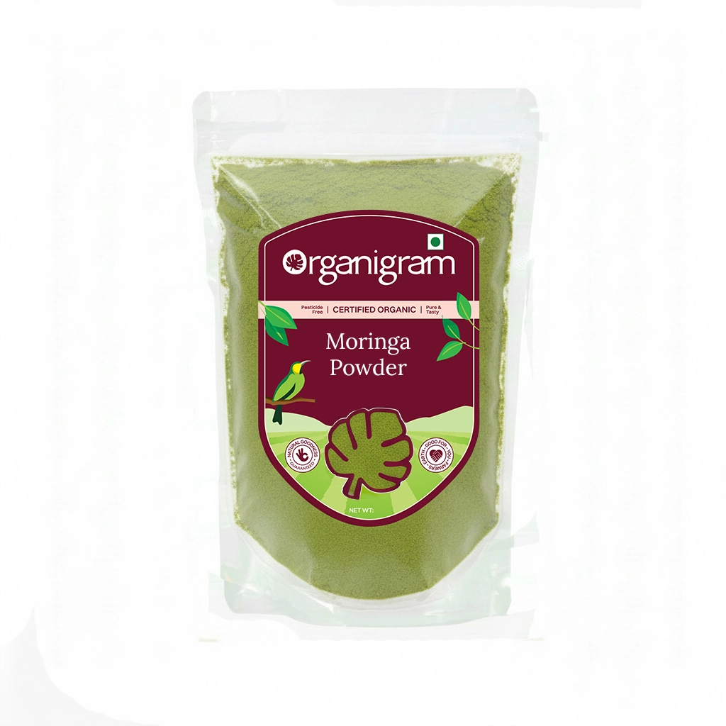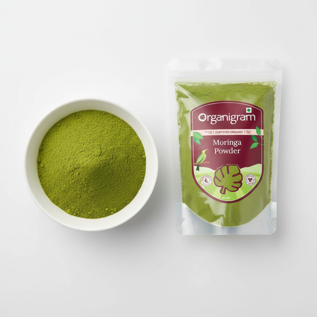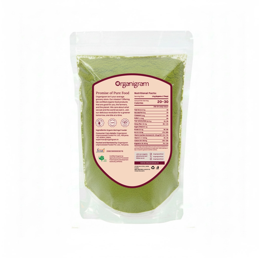 Organigram Organic Moringa Powder is a vibrant, nutrient-rich superfood known as nature’s "Multivitamin." Sourced from certified organic drumstick trees, these leaves are hand-harvested and shadow-dried at low temperatures to preserve their potent vitamins, minerals, and antioxidants. This gentle processing ensures a fine, bright green powder that retains its superior freshness and bioavailability when it reaches your kitchen.